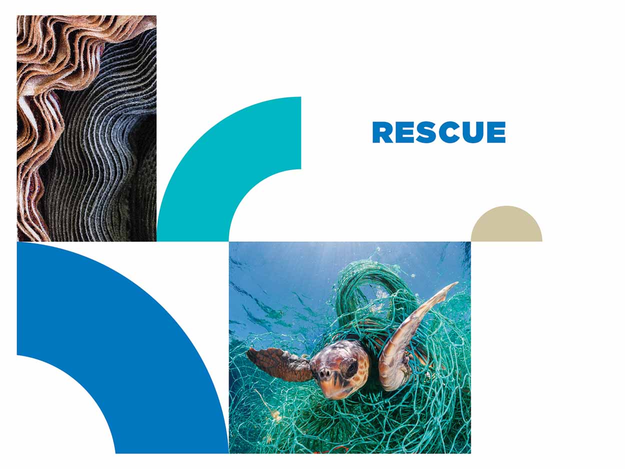 1. Rescue | Redden: Het regeneratiesysteem van ECONYL® start met het redden of inzamelen van afval zoals visnetten, industriële restmaterialen, tapijt en plastic. Dit gebeurt over de gehele wereld. Dit afval wordt gesorteerd en gereinigd, met als doel het terugwinnen van nylon 6. Meer over de verwekte afvalstromen staat beschreven verderop in dit artikel.